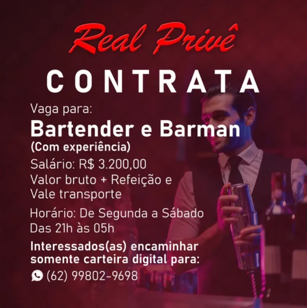 Além da vaga para intérprete, com jornada prevista das 21h às 5h, entre 16 e 21 de março, o local também anunciou oportunidades para bartender, garçom, gerente e serviços gerais, reforçando a equipe para o período do evento