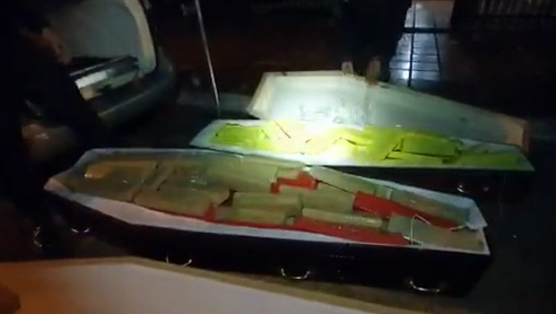 Os policiais fizeram, então, a verificação do veículo e constataarm caixões lacrados. De acordo com o motoristas, os procedimentos seriam de precaução para evitar o contágio pela doença. Desconfiados com as informações desencontradas e o nervosismo do condutor, os policiais decidiram abrir o caixões e confirmar de que se tratava de carregamento de droga.