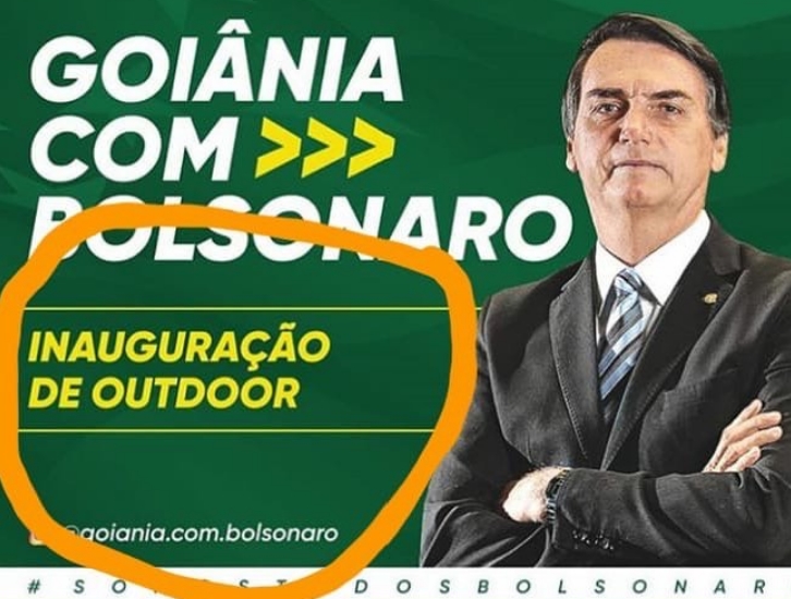 O Ministério Público Eleitoral recebeu a denúncia de que, em um grupo do Facebook intitulado Goiânia com Bolsonaro, foi divulgado um evento, com data marcada para dia 10 de março deste ano, denominado “2ª Inauguração de Outdoor”. Além da inauguração do outdoor com conteúdo de apoio ao candidato, de acordo com a publicação, adesivos seriam distribuídos em um adesivaço. O evento teria acontecido na esquina da Avenida República do Líbano com a rua 5, no Setor Oeste.