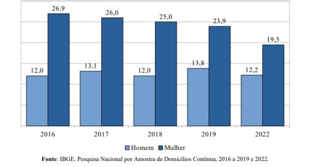 A partir de 2015, observa-se um aumento gradual da desocupação em ambos os gêneros, intensificado a partir de 2020 com a pandemia da COVID-19. Em 2022, em termos relativos, a taxa de desocupação feminina caiu de maneira mais intensa que a masculina, refletindo também na redução da diferença entre os gêneros, que nesse caso foi de 3,3 pontos percentuais, a menor desde 2013. Em 2012, apenas 2,8% das mulheres ocupavam cargos de poder ou eram empregadoras; em 2022, a proporção saltou para 3,3%.