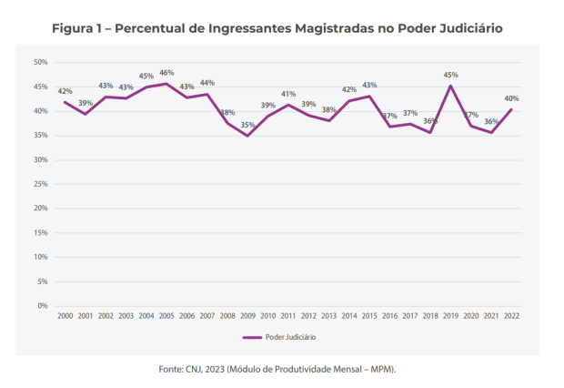 Levantamento do Conselho Nacional de Justiça (CNJ) de 2023 mostra que apesar do crescimento ao longo dos anos, a composição dos tribunais brasileiros, seja em nível estadual, federal ou militar, ainda terá homens em maioria. A série histórica mostra que os índices de magistradas no Poder Judiciário saíram de 24,6% em 1988 para 40% em 2022.