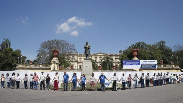 Pesquisadores, servidores e estudantes do museu fizeram um abraço hoje para marcar um mês do incêndio que destruiu um rico acervo que incluía coleções científicas conservadas e estudadas pelos Departamentos de Antropologia, Botânica, Entomologia, Invertebrados, Vertebrados e Geologia e Paleontologia.