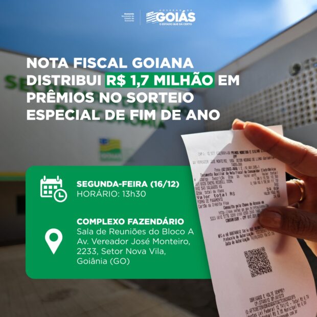 Nesta segunda-feira, 16, o Governo de Goiás realiza um sorteio especial de fim de ano do Programa Nota Fiscal Goiana, premiando consumidores e times de futebol com um total de R$ 1,7 milhão. O evento, marcado para às 13h30 no Complexo Fazendário, no setor Nova Vila, Goiânia, contará com a presença do secretário de Economia, Sérvulo Nogueira. Serão sorteados R$ 700 mil entre participantes cadastrados no programa e R$ 1 milhão destinados aos clubes da primeira divisão do Campeonato Goiano, no âmbito da premiação ‘Time Goiano do Coração’.