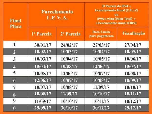 Conforme o calendário apresentado, os motoristas continuam podendo parcelar o imposto em até três vezes, dependendo do final da placa de cada veículo. O condutor que tem o final de placa 1, por exemplo, paga a primeira parcela em janeiro, ou paga uma única parcela até o dia 27 de março. (Confira a tabela abaixo)