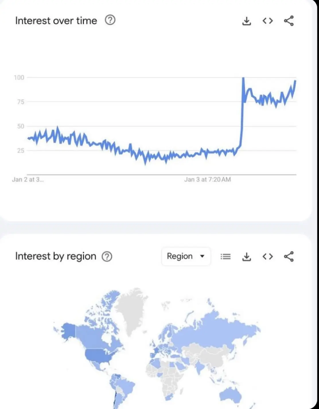 Um mapa divulgado pela Nike mostra o interesse dos internautas no mundo inteiro pelo “outfit” de Nicolas Maduro logo depois de ser capturado. Os países que aparecem em azul claro e azul escuro são os que compraram o moleton via internet.