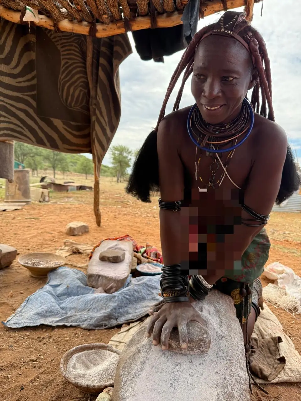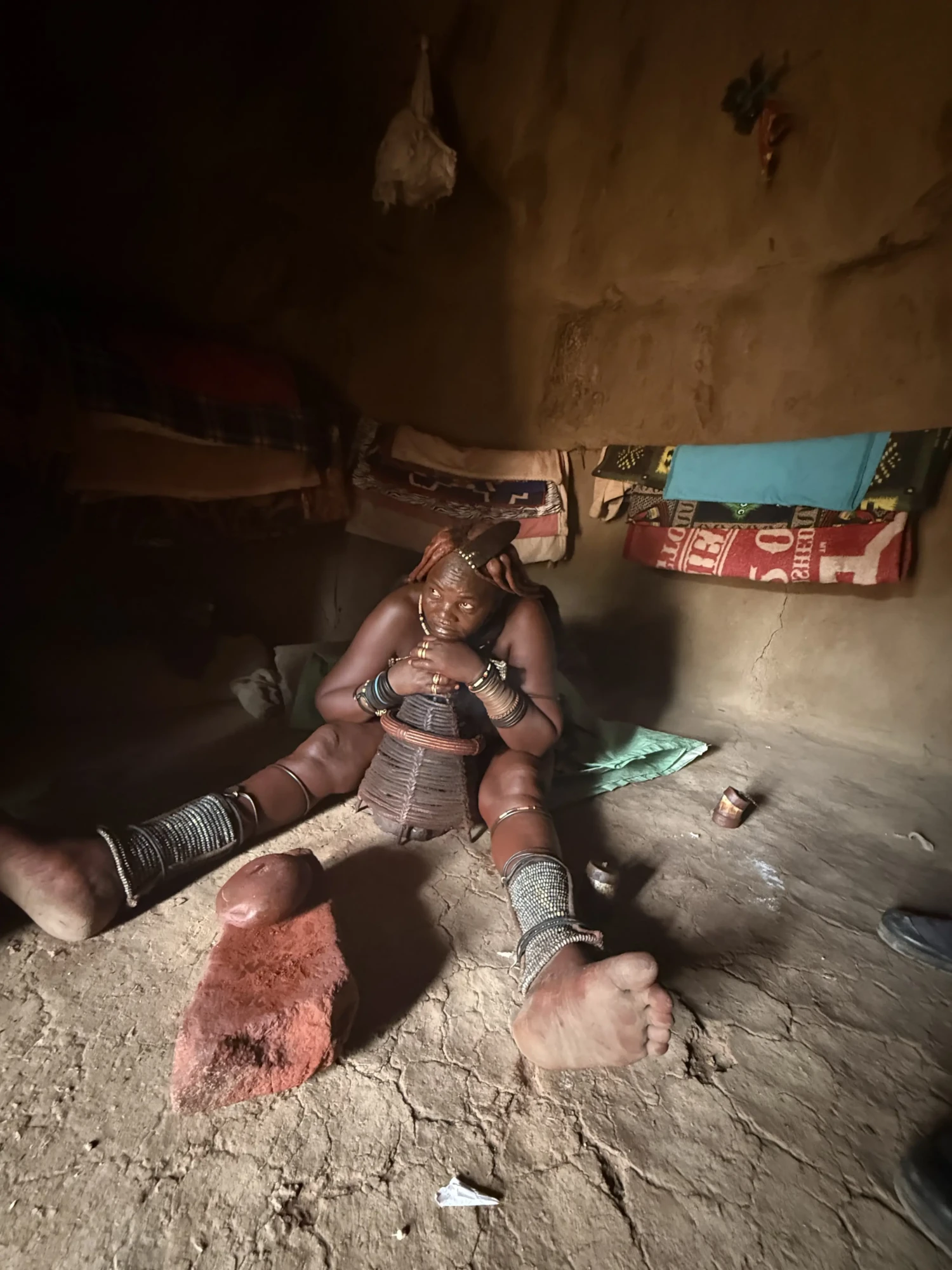 Sou convidado para entrar em uma das cabanas de barro. Lá dentro, uma mulher Himba toma banho. Não o banho tradicional como estamos acostumados. A mulher conta que, esse tipo de banho, ela nunca tomou. A limpeza se resume a ervas aromáticas amassadas com um tipo de pedra colorida amassada.