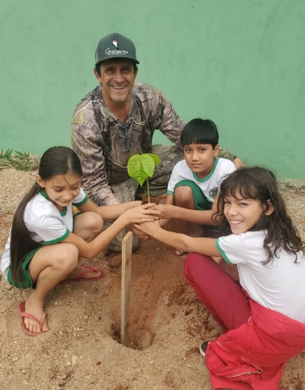 “Levamos as crianças até os ninhos, deixamos elas verem os filhotes. A prefeitura ajuda com ônibus e escada. Elas ficam encantadas”, conta. “Também plantamos mais de mil mudas de xixazeiro. Cada criança adota uma árvore, planta no sítio do pai. É assim que começa a mudar o mundo.”