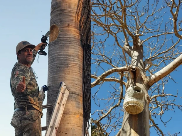 “Ele desenhou o modelo e me explicou: faz a frente, as laterais e o fundo, deixa a parte de baixo aberta e encaixa o ninho no tronco. A arara entra, começa a cavar e faz o resto. É um trabalho conjunto entre o homem e a natureza”, descreve.