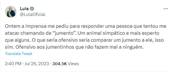 Um dia após ser chamado de “jumento” pelo ex-presidente Jair Bolsonaro, durante um evento de filiação do PL na Câmara Municipal de São Paulo, o presidente Lula da Silva deu a resposta pelas redes sociais. De acordo com o mandatário, jumento é um “animal simpático e mais esperto que alguns”. Segundo ele, “o que seria ofensivo seria comparar um jumento a ele [Bolsonaro], isso sim”.