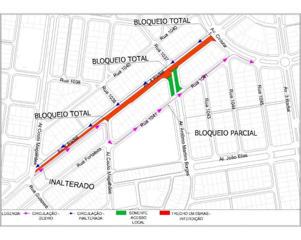 Nesta terça-feira, 4, a Secretaria Municipal de Trânsito, Transportes e Mobilidade (SMT) irá bloquear uma das pistas da Avenida 4ª Radial, no trecho entre a Alameda Couto Magalhães e a Avenida Circular. A interdição ocorrerá às 7h e podem durar até 40 dias. As obras fazem parte da construção do Bus Rapid Transit (BRT).