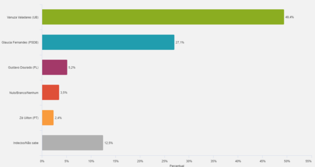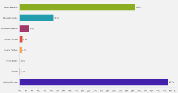 Já na espontânea, logo atrás de Vanuza Valadares aparecem Gláucia Fernandes, com 10,8%, Gustavo Dourado, com 0,9%, Coronel Polidório, com 0,7% e Wesley Borges, com 0,2%.