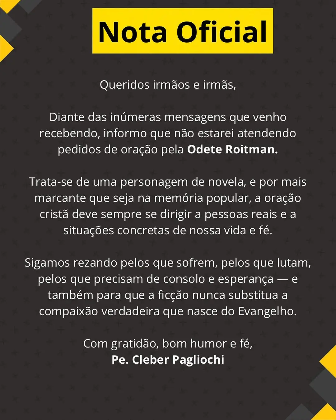 O padre Cleber Pagliochi, da Paróquia São Daniel, em Seara, Santa Catarina, precisou emitir uma nota oficial para esclarecer os pedidos de oração pela personagem. Segundo Pagliochi, ele recebeu inúmeros pedidos de oração pela alma de Odete Roitman, mas deixou claro que não atenderá aos pedidos.