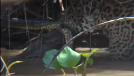 No vídeo, os felinos aparecem atacando a serpente em uma área entre terra e água