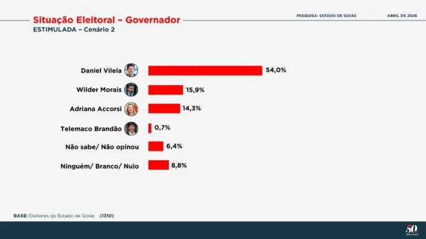 Em um cenário sem Adriana Accorsi e Telêmaco Brandão, Daniel Vilela tem 46,6%, Marconi Perillo apresenta 26,9%, Wilder Morais tem 11,6% e Luis Cesar Bueno registra 1,9%.