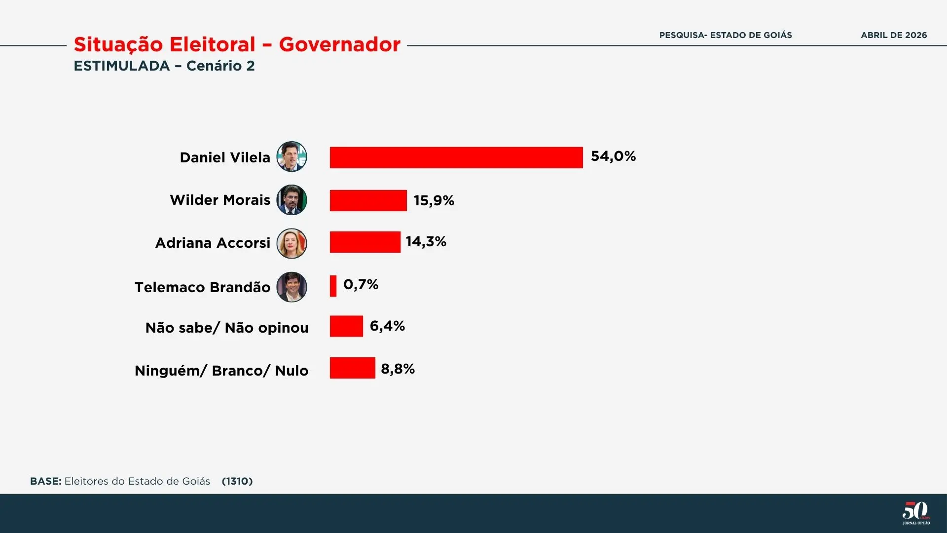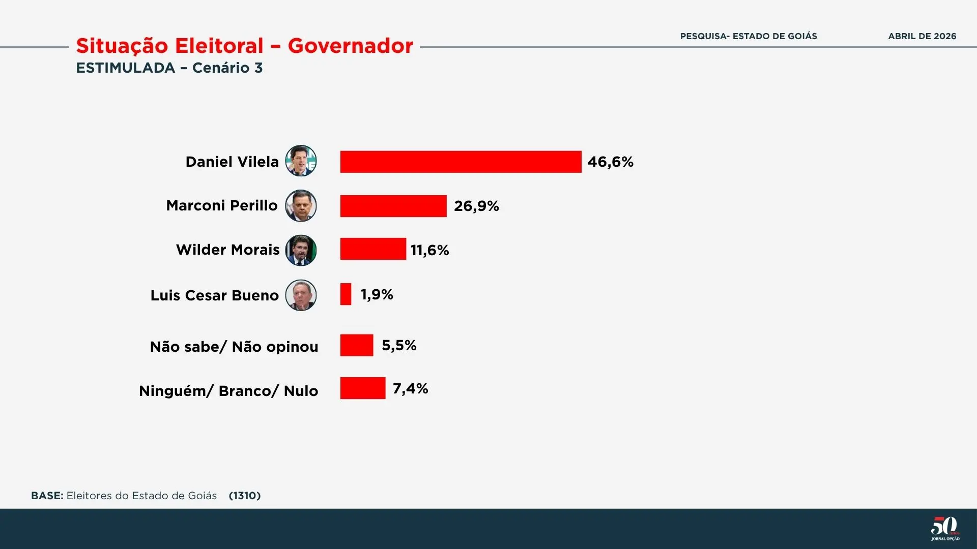 Em um cenário sem Adriana Accorsi e Telêmaco Brandão, Daniel Vilela tem 46,6%, Marconi Perillo apresenta 26,9%, Wilder Morais tem 11,6% e Luis Cesar Bueno registra 1,9%.