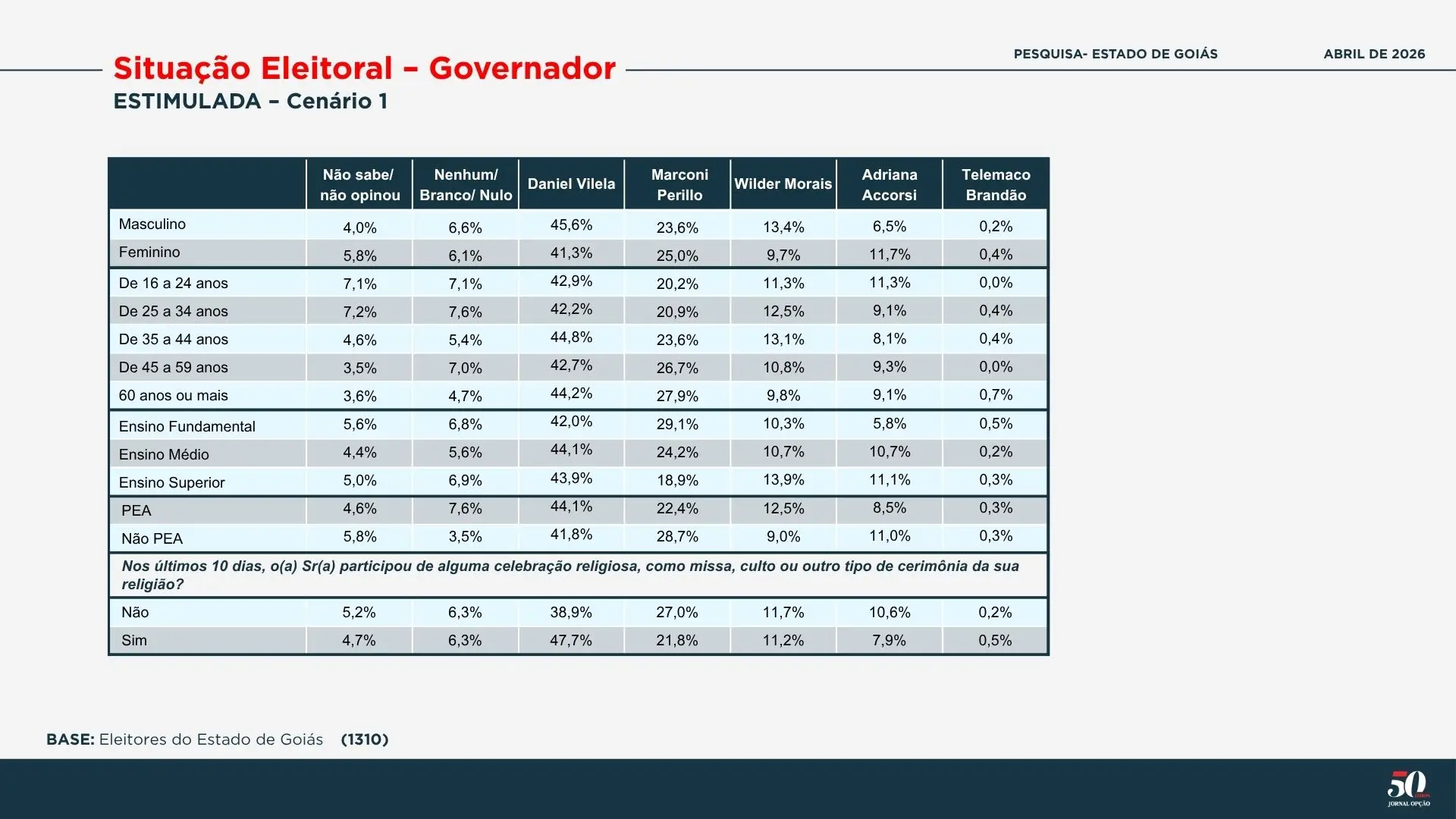 O levantamento também trouxe recortes específicos. Por gênero, o nome de Daniel Vilela tem maior preferência do público masculino (45,6%) do que o feminino (41,3%).