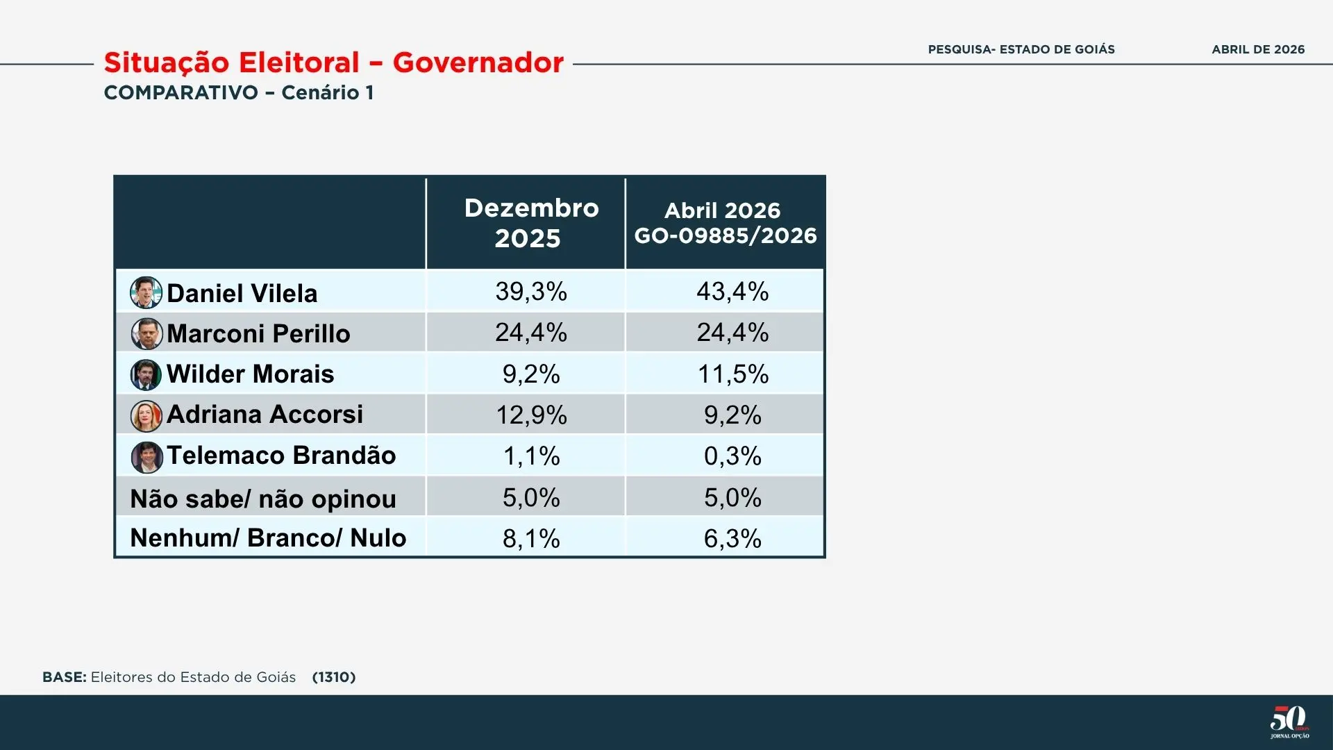 A pesquisa trouxe ainda um comparativo com um levantamento realizado em dezembro do ano passado. Na ocasião, Daniel Vilela aparecia com 39,3%; Marconi já registrava 24,4%; Adriana Accorsi tinha 12,9% e Wilder Morais apresentava 9,2%. Telêmaco Brandão tinha 1,1%; nenhum, branco ou nulo somavam 8,1% e não sabe ou não opinou manteve o índice de 5%.