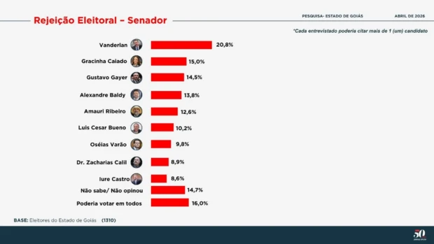 Vanderlan Cardoso é o nome mais rejeitado entre os entrevistados, com 20,8%. Gracinha Caiado vem em seguida, com 15%. Tecnicamente, ela está empatada com Gustavo Gayer, que registrou 14,5%. Alexandre Baldy tem resistência de 13,8%, Amauri Ribeiro tem a rejeição de 12,6% e Luis Cesar Bueno é um nome negativo para 10,2%, Oséias Varão não é bem visto por 9,8%. Os menos rejeitados são Dr. Zacharias Calil (8,9%) e Iure Castro (8,6%).