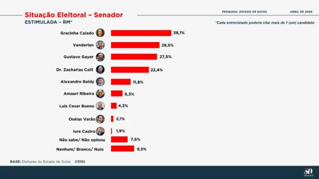 A ex-primeira-dama de Goiás, Gracinha Caiado (UB), lidera a corrida ao Senado, com 39,1% das intenções de voto, segundo levantamento estimulado da Paraná Pesquisas, encomendado pelo Jornal Opção. Os nomes de Vanderlan Cardoso (PSD) e Gustavo Gayer (PL) aparecem tecnicamente empatados, registrando, respectivamente, 28,5% e 27,5% da preferência do eleitorado.