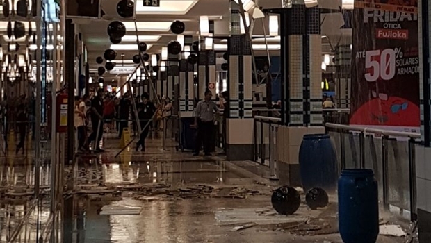 Imagens que circulam pelas redes sociais mostram que o gesso do teto do primeiro piso cedeu por causa da força da água, Local foi isolado, mas o shopping não chegou a ser fechado e os reparos já estão sendo feitos. Ninguém ficou ferido.