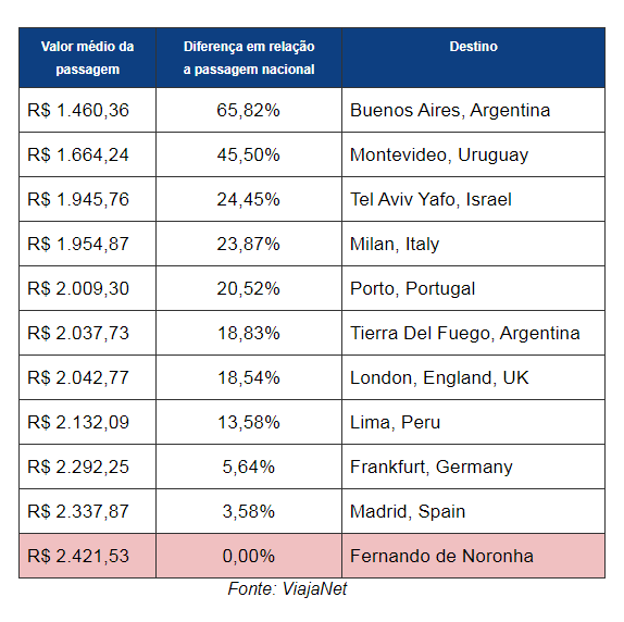 O trecho comparado, entre São Paulo e Fernando de Noronha custa em médica R$ 2,4 mil para embarque entre dezembro deste ano e janeiro de 2020. Comparado com esse valor, o trecho entre São Paulo e Montevideo, no Uruguai, é 45,5% mais barato. Para Tel Aviv, em Israel, a diferença é de 24,45%.