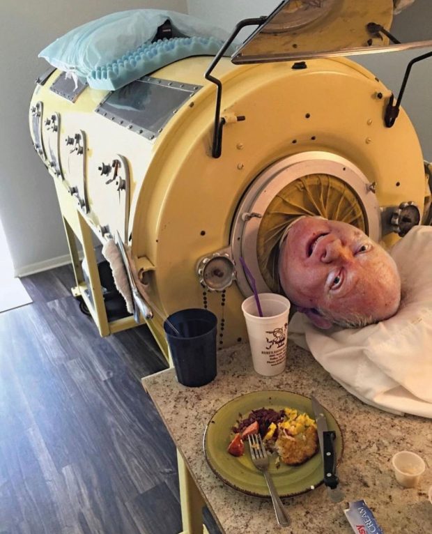 Se trata de uma câmara de 272 quilos, que tem as passagens de ar seladas, permitindo apenas que a cabeça do paciente fique para fora. A maioria dos pacientes só usou esse aparelho durante algumas semanas ou meses, dependendo do caso específico.