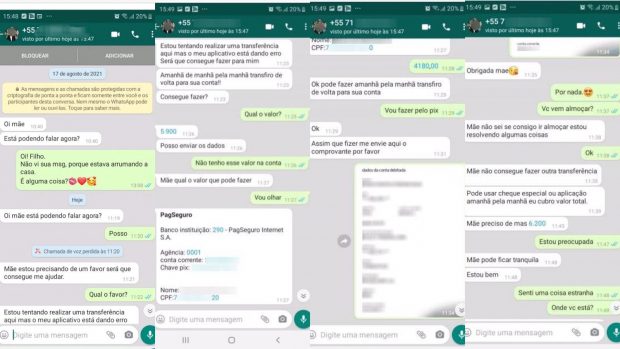 Ação foi realizada após boletim de ocorrência registrado em Salvador, na Bahia onde a vítima mora. Nesse caso, os criminosos utilizaram a foto do filho da vítima no perfil do aplicativo de mensagens e, após habilitarem um número novo, enviaram mensagens para ela solicitando R$5.900, com pretexto de que não estavam conseguindo fazer transferências, em virtude do o aplicativo bancário “estar dando erro”. A vítima transferiu R$4.180.