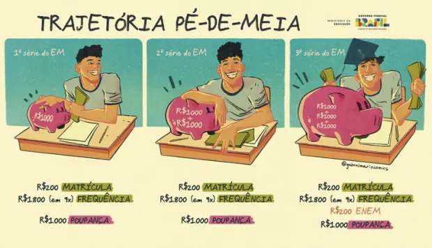 O Pé-de-Meia é um programa de incentivo financeiro-educacional, na modalidade de poupança, destinado a promover a permanência e a conclusão escolar de estudantes matriculados no ensino médio público. Por meio do incentivo à permanência escolar, o programa quer democratizar o acesso e reduzir a desigualdade social entre os jovens do ensino médio, além de promover mais inclusão social pela educação, estimulando a mobilidade social.