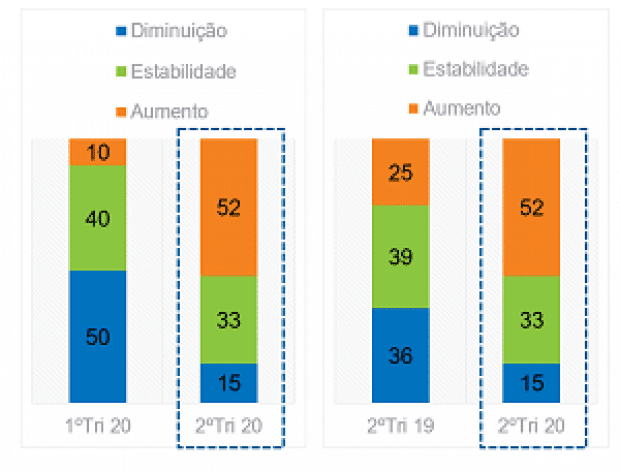 Quanto ao nível de endividamento, 44% acreditam em aumento, 33% em estabilização e 23% em diminuição. No trimestre anterior esses números eram de, respectivamente, 12%, 30%, 58%. Já no mesmo período de 2019, eram de 15%, 33% e 52%.