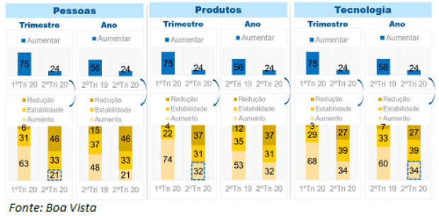 De acordo com a Pesquisa Perspectiva Empresarial da Boa Vista, realizada no 2º trimestre de 2020, 24% das empresas entrevistadas afirmam que vão aumentar os investimentos ainda este ano, enquanto no 1º trimestre eram 75%. Já no mesmo período de 2019, 56% das empresas tinham esta intenção.