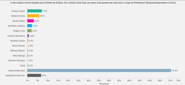 Nesta modalidade de questionário, na qual não são apresentados nomes, o pré-candidato Gustavo Gayer (PL) é o mais lembrado, com 7,2% das intenções de voto. Adriana Accorsi (PT) vem em segundo lugar, com 5,8%. Sandro Mabel (UB) está em terceiro, com 3,2%. Vanderlan Cardoso (PSD) surge em quarto, com 2,3%. Rogério Cruz (SD) vem em quinto, com 2,2%. Outros políticos como Silvyê Alves (UB) e Gustavo Mendanha (MDB) foram lembrados, mas não devem concorrer a prefeito em 2024.
