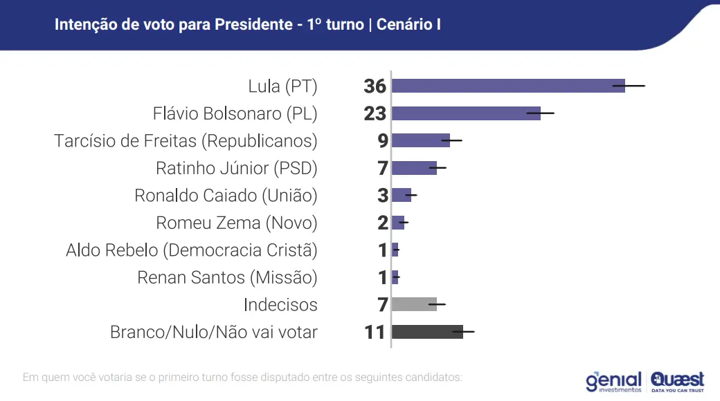 Pesquisa Genial/Quaest: Lula tem 36% dos votos contra 46% dos candidatos da direita