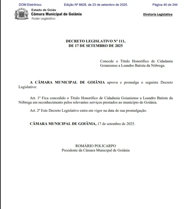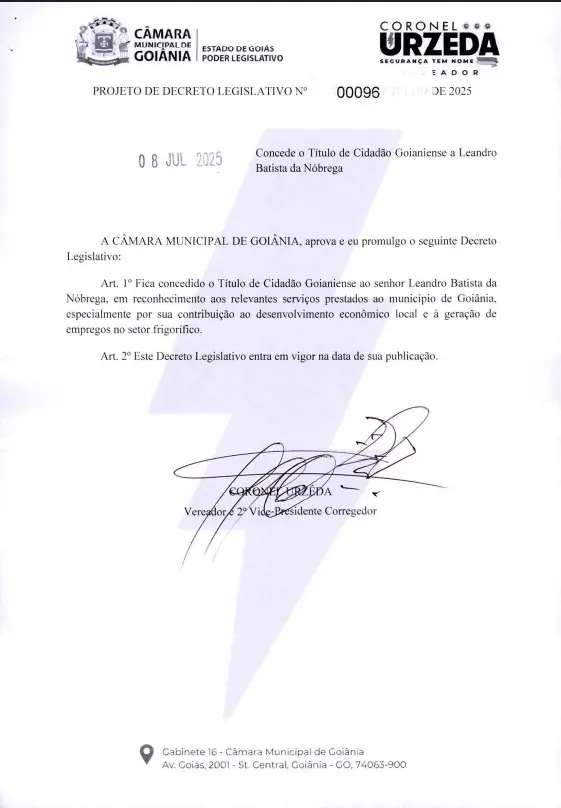 O decreto legislativo, aprovado e promulgado, justifica a homenagem “em reconhecimento pelos relevantes serviços prestados ao município de Goiânia”, citando sua contribuição para o desenvolvimento econômico local. A condecoração, concedida a um empresário cujas ações estão sob escrutínio judicial por práticas discriminatórias e cuja gestão é marcada por uma tragédia evitável, mostra o consentimento político a condutas que instigam a ordem democrática e a dignidade humana.