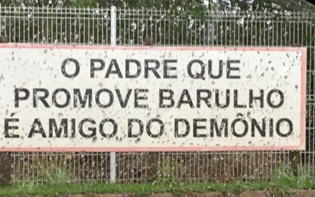Em uma das placas, instalada em uma grade, está a frase “O padre que promove barulho é amigo do demônio”. Em outra, é possível ler “Quem reza irá par ao céu, quem não reza irá para o inferno”, seguido de “Quem não reza é pior que o demônio”. Em outra área, está escrito: “quem promove o barulho serve ao demônio”.
