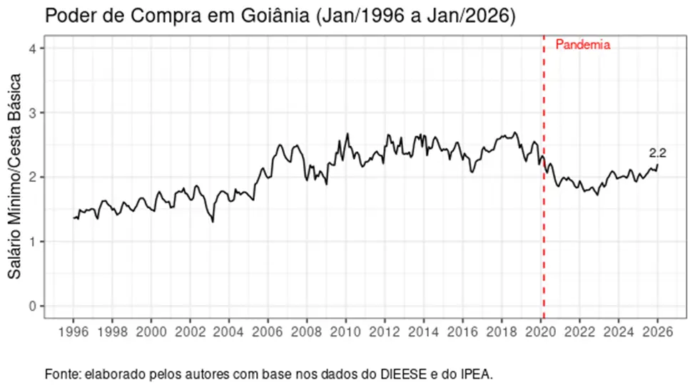 De acordo com os dados mais recentes, em janeiro de 2026 um trabalhador que recebe um salário mínimo na capital goiana consegue comprar aproximadamente 2,20 cestas básicas (cada cesta básica custando R$ 735,94). O resultado indica uma recuperação em relação aos anos mais críticos da pandemia e sugere um nível de poder de compra próximo ao observado no início de 2020. Em janeiro de 2020, por exemplo, um salário mínimo comprava aproximadamente 2,28 cestas básicas, ou seja, próximo ao poder de compra registrado em janeiro de 2026. Para uma visão mais ampla, pode-se visualizar no gráfico a seguir a trajetória do poder de compra ao longo dos anos para Goiânia.