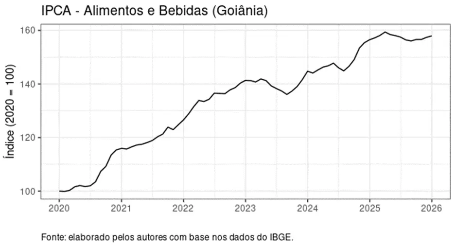 Portanto, a inflação persistente e o cenário externo instável podem não apenas ajudar a explicar a conjuntura atual, como também corroer o poder de compra das famílias. Por exemplo, a inflação acumulada dos alimentos e bebidas (Índice de Preços ao Consumidor Amplo, grupo Alimentos e Bebidas), em Goiânia, de janeiro de 2020 a janeiro de 2026, foi de aproximadamente 58%. Com inflação acumulada de 40,3% no período pandêmico (01/2020-01/2023) e 11,7% de janeiro de 2023 a janeiro de 2026, conforme dados do IBGE. A seguir, observamos o comportamento do IPCA, grupo Alimentos e Bebidas, com base nos dados verificados.