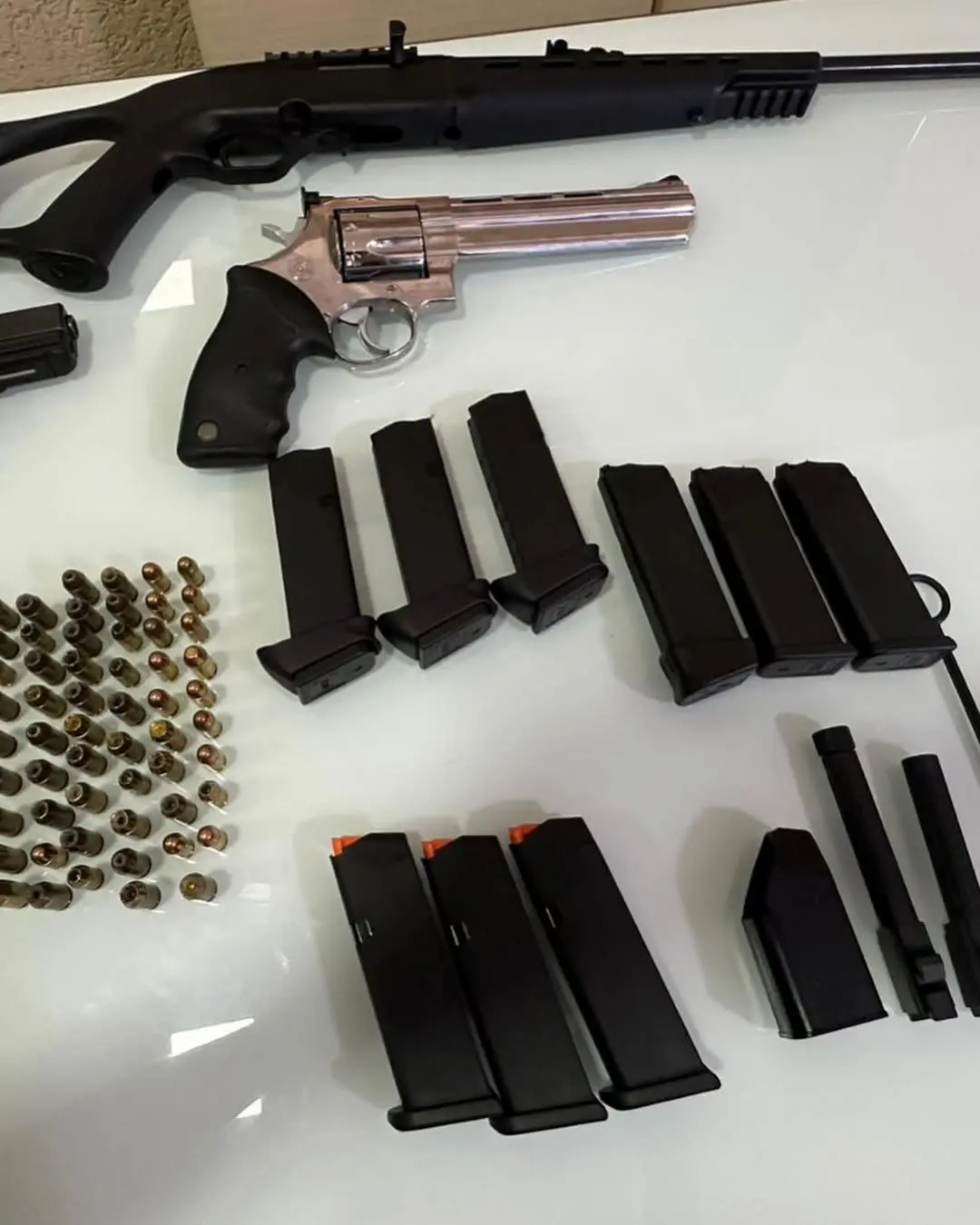 As buscas ocorreram em dois endereços, nos setores Cândida de Moraes e Bueno. No primeiro local, foram apreendidos rifles, espingardas, um revólver, uma pistola e munições. Já no segundo imóvel, os policiais localizaram outras armas longas.