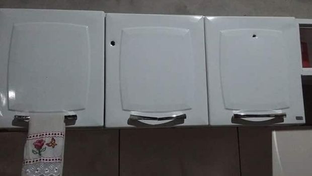 As balas entraram através do vidro de uma janela, acertando o armário da cozinha e uma cortina. Apesar do susto, ninguém ficou ferido.