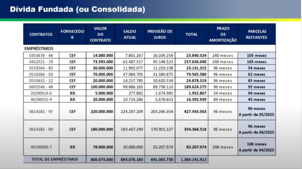 A dívida fundada do município, que resulta de contratos de empréstimos com a Caixa Econômica Federal e o Banco do Brasil, soma R$ 1,38 bilhão. O montante inclui juros acumulados e saldos atualizados, com prazos de amortização que variam de 8 a 20 anos. Os principais empréstimos contratados são: