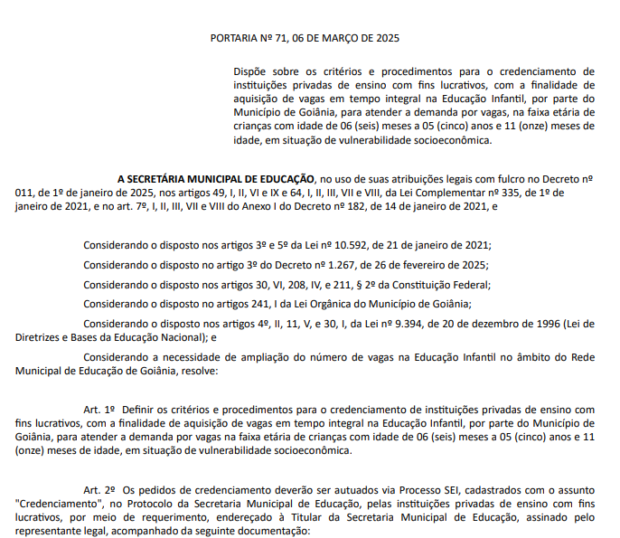 A Portaria nº 71, publicada pela SME, estabelece os critérios e procedimentos necessários para o credenciamento de instituições privadas com fins lucrativos que desejam oferecer vagas à Prefeitura. As instituições interessadas devem enviar um requerimento ao Protocolo da SME, localizado no Setor Leste Universitário.