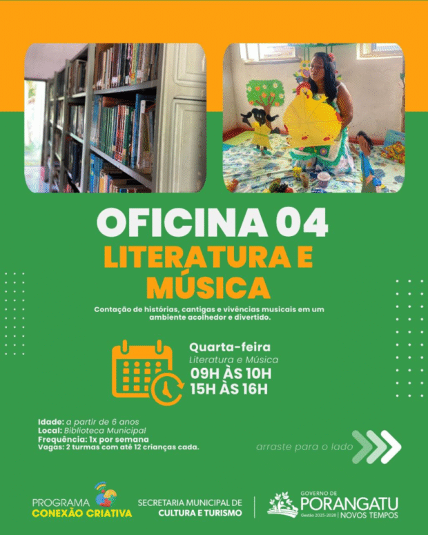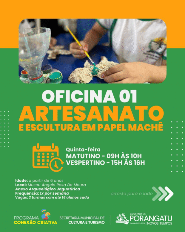 A Prefeitura de Porangatu iniciou as inscrições para as oficinas inclusivas do programa Conexão Criativa – Conectando com Afeto, voltado especialmente para crianças neurodivergentes. Abertas no dia 21, as inscrições seguem até a próxima sexta-feira, 30, e devem ser feitas presencialmente na sede da Secretaria Municipal de Cultura. As vagas são limitadas.