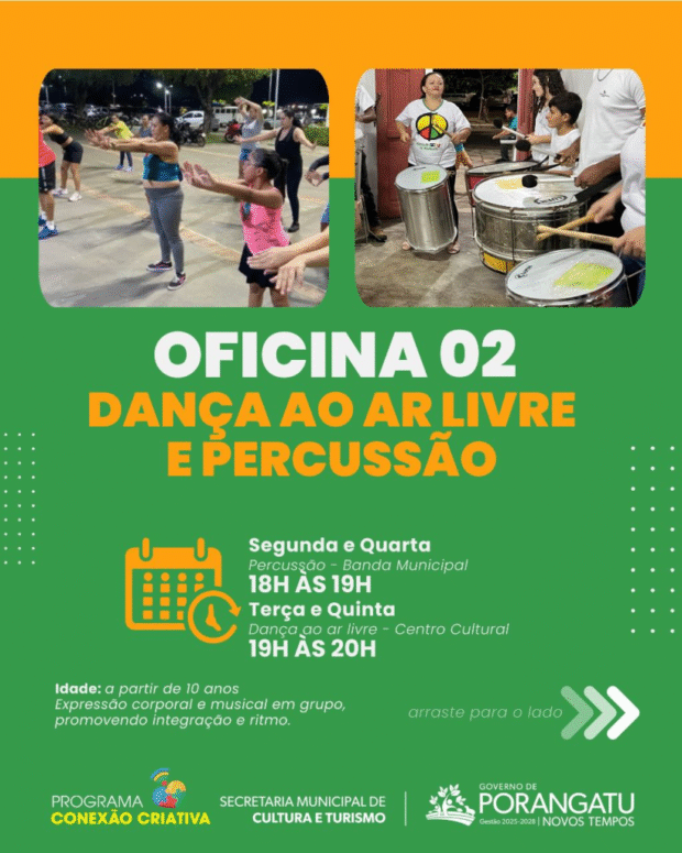 - Dança ao ar livre e percussão: a partir dos 10 anos, com aulas de percussão às segundas e quartas-feiras (18h às 19h), e dança às terças e quintas-feiras (19h às 20h), entre a Banda Municipal e o Centro Cultural.