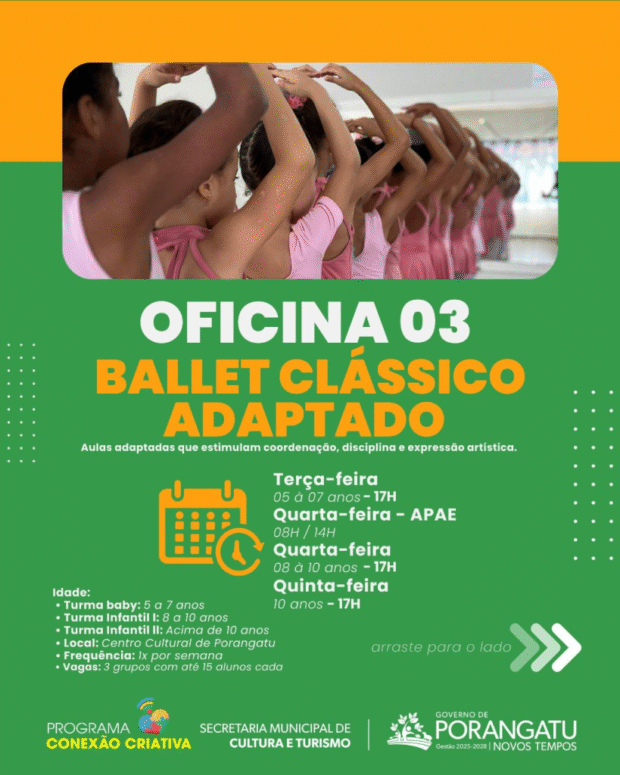 - Ballet clássico adaptado: voltado para crianças entre 5 e 10 anos, com turmas às terças, quartas e quintas-feiras, no Centro Cultural de Porangatu e na APAE.