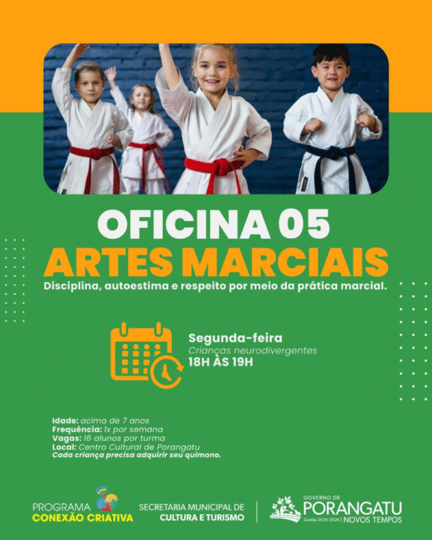 - Artes marciais: destinada a crianças neurodivergentes com mais de 7 anos, às segundas-feiras, das 18h às 19h, no Centro Cultural. É necessário que cada participante adquira seu próprio quimono.