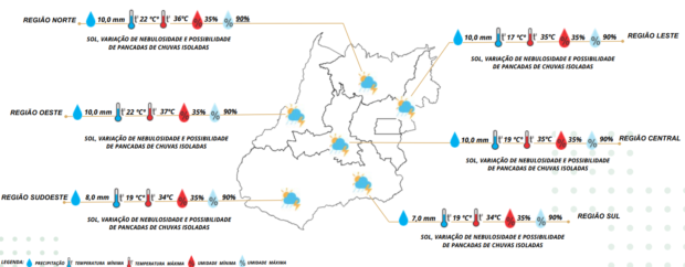 De acordo com o Instituto Nacional de Meteorologia (Inmet), no noroeste de Goiás as chuvas devem ocorrer ao longo da semana. Já no sul e leste de Goiás, a previsão indica chuvas irregulares a partir desta quarta-feira, 12.