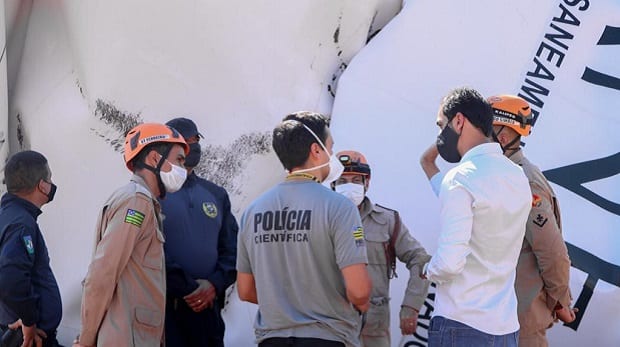 Após queda de um reservatório no Campo do Trajano, em Senador Canedo, ao menos quatro casas foram atingidas e 20 mil pessoas estão sem abastecimento de água. Técnicos trabalham para reestruturar a rede de transmissão para que não falte água tratada nas casas que, antes, eram abastecidas pelo reservatório