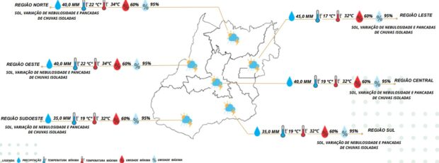 A temperatura mínima prevista é de 19°C e máxima de 32°C nas regiões Central, Sul e Sudoeste do estado. Nas regiões Norte e Oeste a temperatura varia dos 22°C aos 34°C. A região Leste do território goiano apresenta menor temperatura para o início desta semana, com 17°C, e máxima também de 32°C.