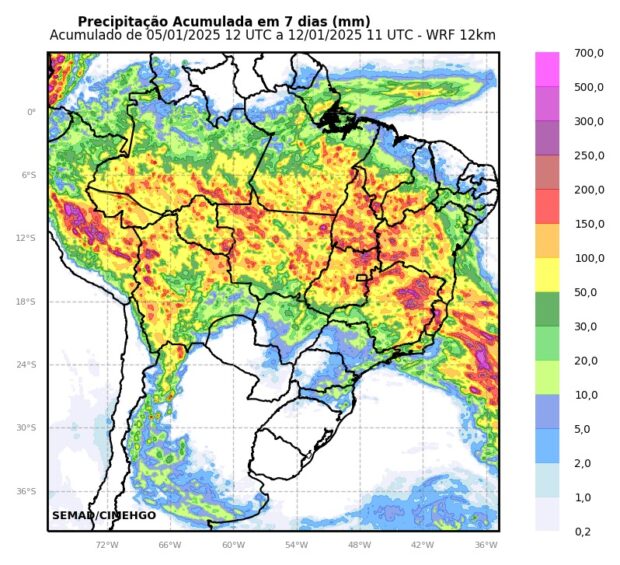 Segundo boletim mais recente do Cimehgo a previsão para a semana é de chuvas irregulares acompanhadas de rajadas de vento e possíveis descargas atmosféricas. “A semana vai ser marcada pela ocorrência de chuvas em todas as regiões do Estado”, garante o órgão. A Zona de Convergência do Atlântico Sul favorece a ocorrência de chuvas, que podem vir como tempestade.
