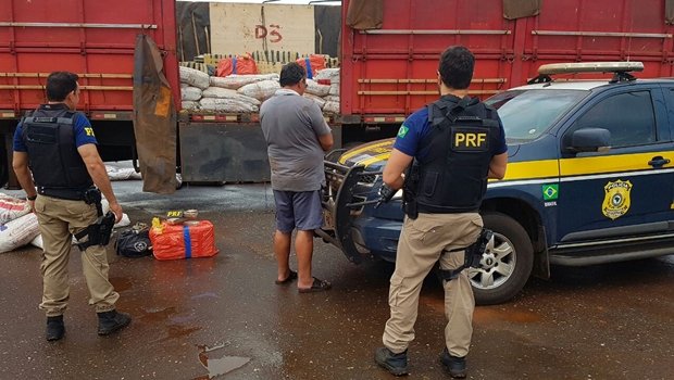 A rodovia estava parcialmente bloqueada para execução de serviços de manutenção em uma passarela no local, quando os agentes que trabalhavam no bloqueio perceberam nervosismo do motorista da carreta ao passar pela barreira.