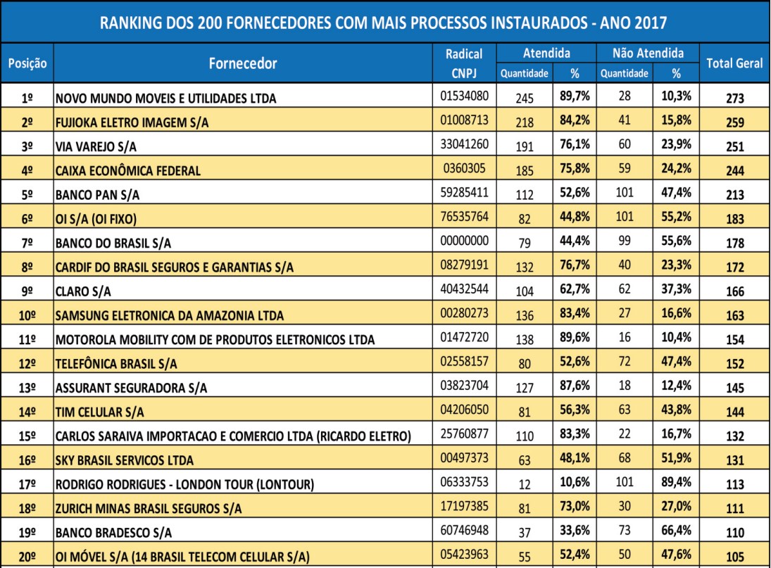 O documento é uma lista das empresas mais demandadas, que constitui as reclamações (processos administrativos) classificadas em “atendidas” e “não atendidas” no ano de 2017, nos quais pode ou não ter havido acordo entre consumidores e fornecedores, quando constatada a violação às normas consumeristas. (A íntegra do cadastro pode ser conferida aqui)